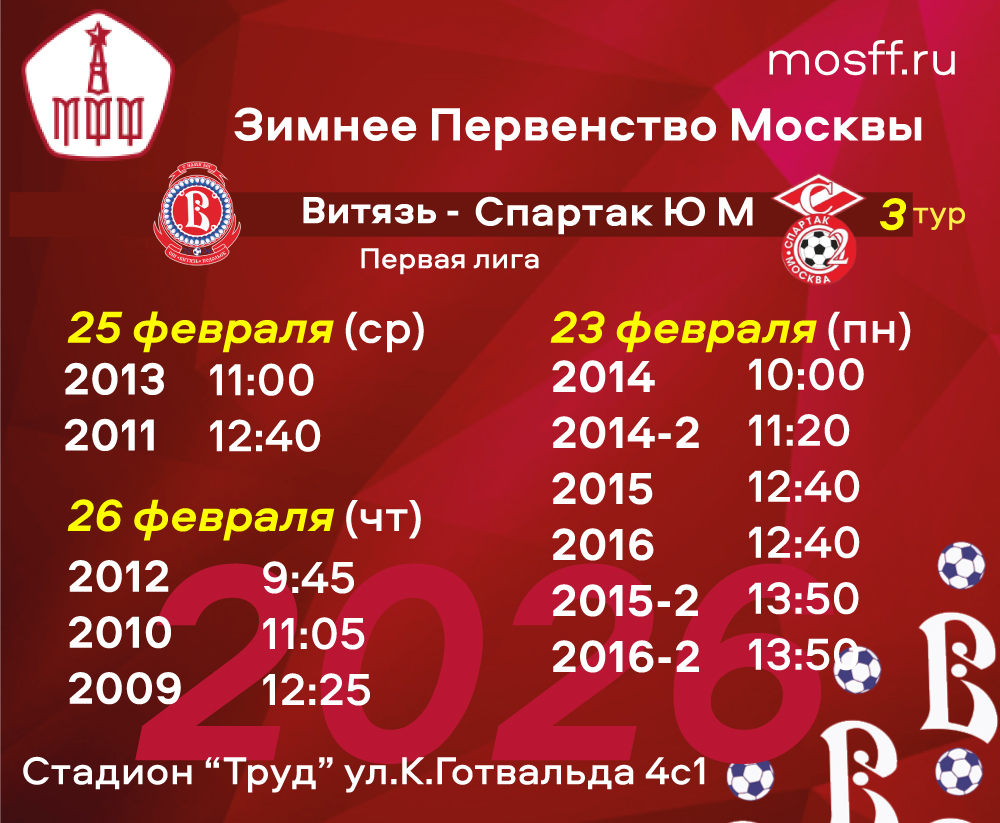 23,25 и 26 февраля Витязь- Спартак ЮМ, перенесенные игры 3 тура Зима 2026 Первая лига